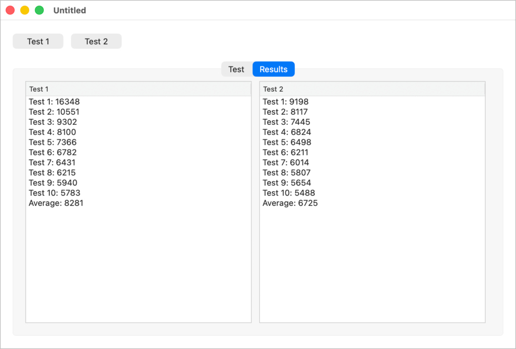 I modified the code to run each test 10 times then compute the average of all 10 tests. Depending on the run, the average time for Test 2 was nearly always shorter. Occasionally the average for Test 1 would be shorter than Test 2 but rarely. In fact, on my M4-based MacBook Pro, Test 2’s average was, in most cases, anywhere from 5% to 25% faster than Test 1. Next I tested it on an M1-based MacBook Pro with similar results. Then I tested it on an x86-based PC running Windows 11. This time Test 2 was slightly slower than Test 1 as I had been expecting from the beginning. Last but not least, I tested on Windows 11 running via Parallels on my MacBook Pro, compiling for ARM-64. In this test, Test 2 was indeed faster. I tried running these tests by changing the order (Test 1 then Test 2 followed by Test 2 then Test 1) and by quitting between runs. None of that seemed to matter.